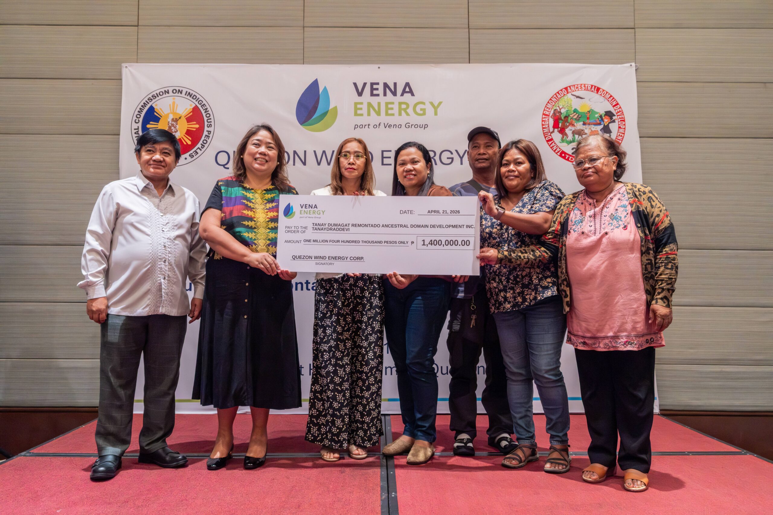 Vena Energy Formalizes Community Support through a Check Turnover Ceremony to host Indigenous Cultural Communities From left to right: Dr. Carlos Buasen Jr., NCIP R4A Regional Director, Ms. Mia Jarumayan,…