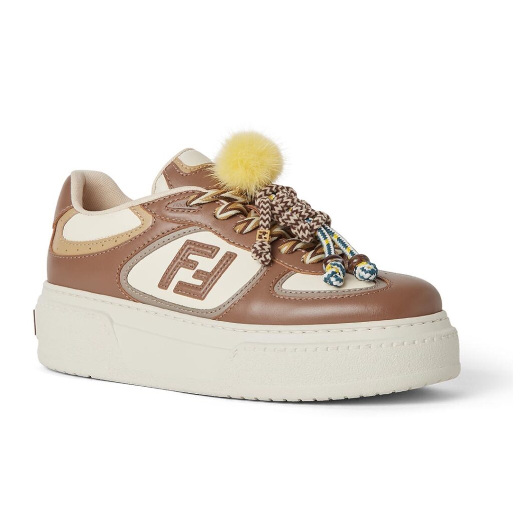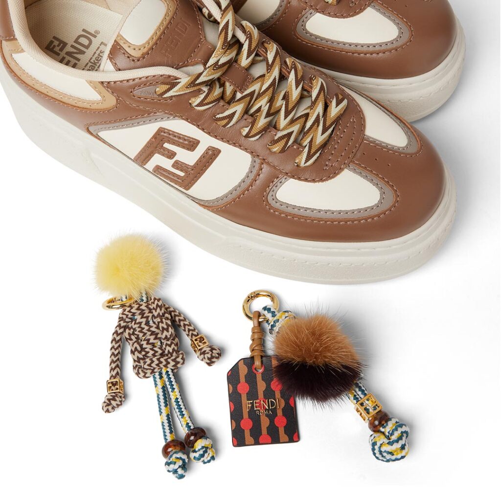 Starting from the FENDI BFF Maxi and Mini characters, the accessorizing frenzy reaches footwear with the new FENDI Match Platform Sneakers with Charms. Elevated with a higher platform and featuring playful miniature charms, thesignature FENDI Match sneakers are reimagined to express individual style and add a touch of FENDI fun to any look. The sleek design of the original shape, launched in 2021, now comes with a 5 cm platform and a smaller FF logo to give full focus to the interchangeable, removable charms, allowing full customization. Each pair is in fact complemented by a set of three decorative charms that are exclusive to each colourway. These whimsical ornaments are handcrafted to evoke a sense of fun and self-expression while celebrating FENDI’s heritage, starting from a cute doll sporting a mink pompom head and a bicolour chevron coat made from velvety laces. A tag charm features the iconic FENDI Pequin striped logo-non-logo in the signature tones of dark brown and tobacco and, completing the set, a charm braided with hiking laces is embellished with a two-toned mink pompom. The new FENDI Match Platform Sneakers will be available in four colour combinations with matching chevron-patterned laces: cream and caramel, mint green and white, dusty pink and cream, brown and cream.