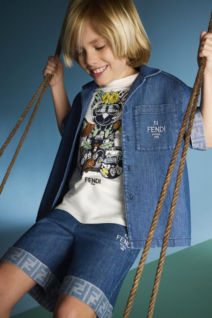 For girls, the collection blossoms with floral motifs that become delicate macro-FFs on white cotton poplin and muslin dresses, skirts, and blouses with puffed sleeves, and embroidered flowers on organza for a touch of youthful elegance. A charming off-shoulder white dress features eyelet lace and a subtle FENDI Roma 1925 lettering, also embroidered on a light blue organza piece and on knitwear sets in a punch-hole pattern with a 3D effect. Mini Me chambray pieces in a blue denim shade are adorned with signature ruffles and ton sur ton floral prints from the Women’s collection, or feature a FF logo interior as seen on a maxi skirt or FENDI Go To Jacket.