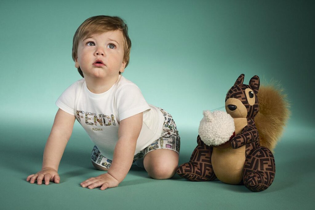 Baby proposals echo the same themes of the kids’ line, declined in comfortable shapes and supple materials. Charming nursery kits explore embroidered squirrels, teddy bears and bunnies, together with Argyle knitwear sets with a subtle FENDI touch in delicate pink or light blue. The beloved FENDI Kids teddy bear is ever-present, as a print on cotton rompers or turned into cute pockets on a gabardine dress.