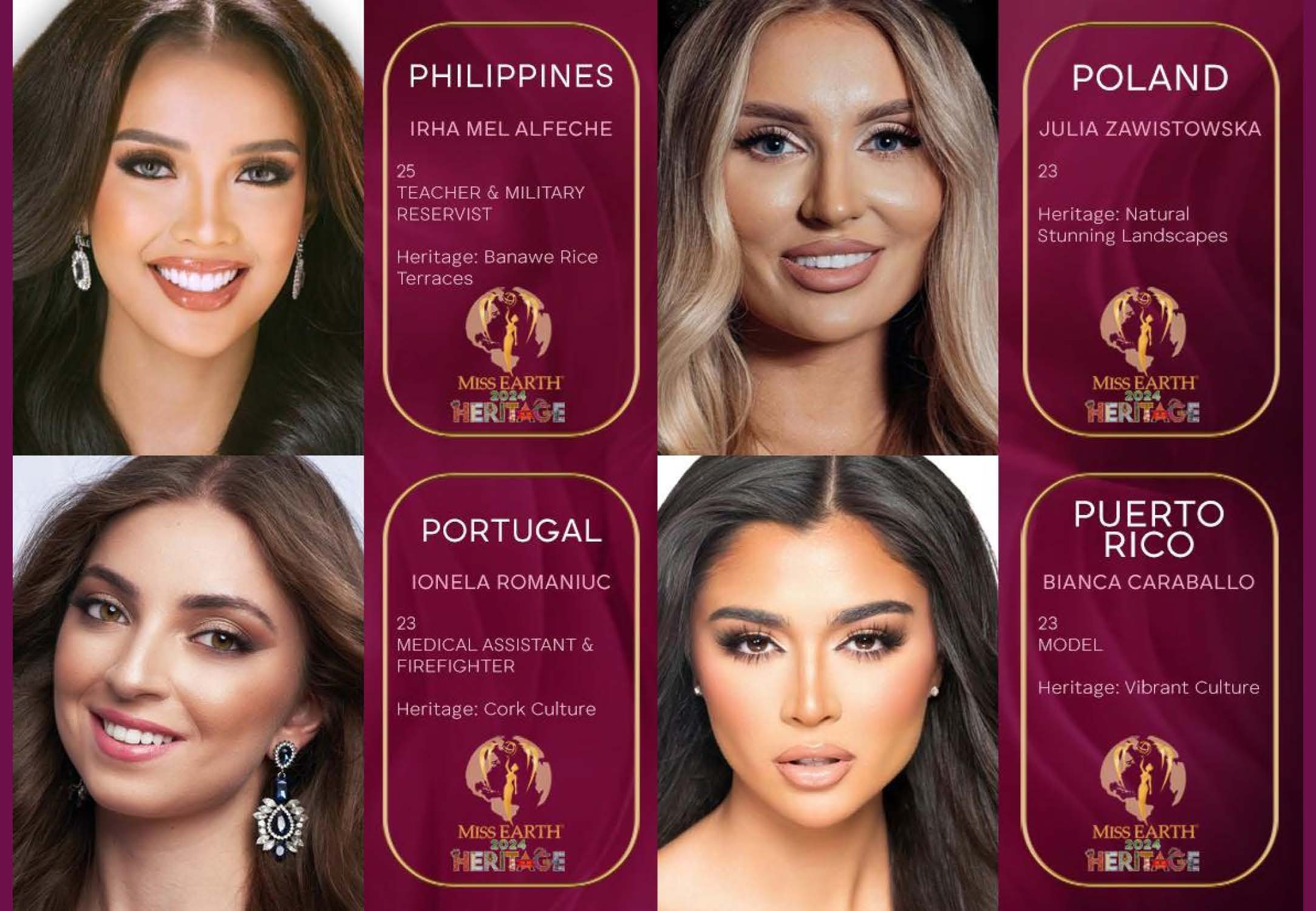 “Not many are aware that HERITAGE plays an important role in Environmental Protection which is passed down from generation to generation. Therefore, MISS EARTH ambassadors from each country will be promoting their Heritage to the world by sharing its history, the beauty of heritage landmarks, artistic craftsmanship or livelihood, culture and traditions and even family values and heirlooms.” – Miss Earth co-founder, Lorraine E. Schuck, simply elaborates.