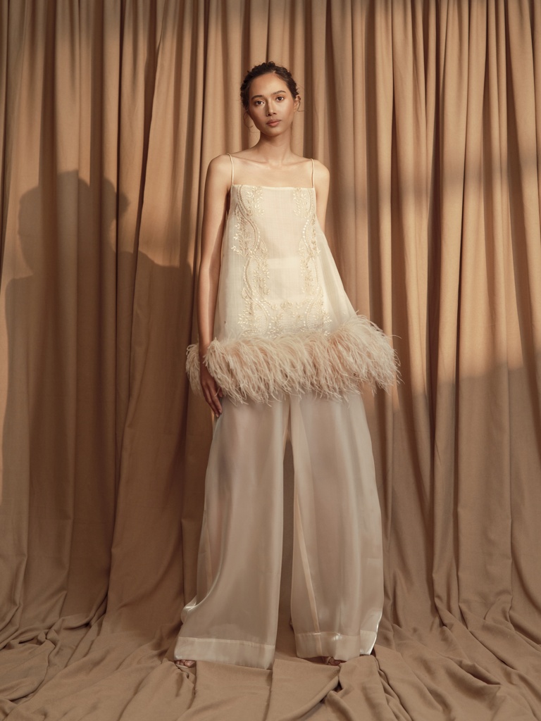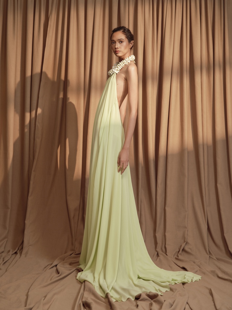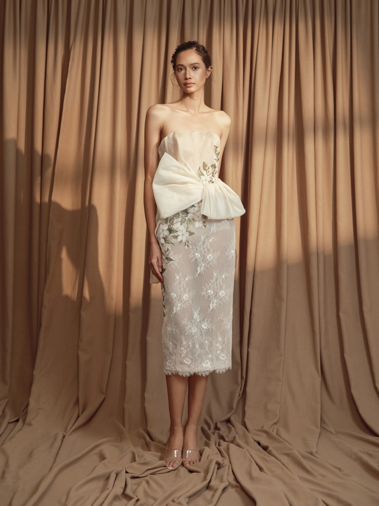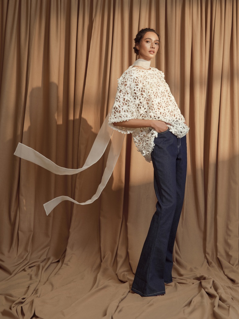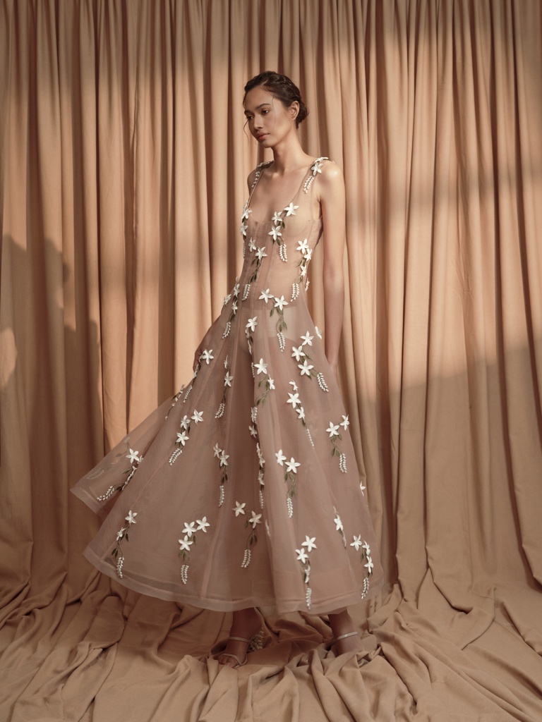 “This collection is an intimate reflection of my childhood memories spent at my grandmother’s home—I still distinctly remember the fragrance of Sampaguita flowers and the sight of elegant lace curtains and vintage heirlooms,” the designer shares. “Each piece in the collection is an homage to that space-turned-memory—an ode to the floral patterns hand-stitched by my grandmother and to the timeless beauty that exists in things passed down through generations.”