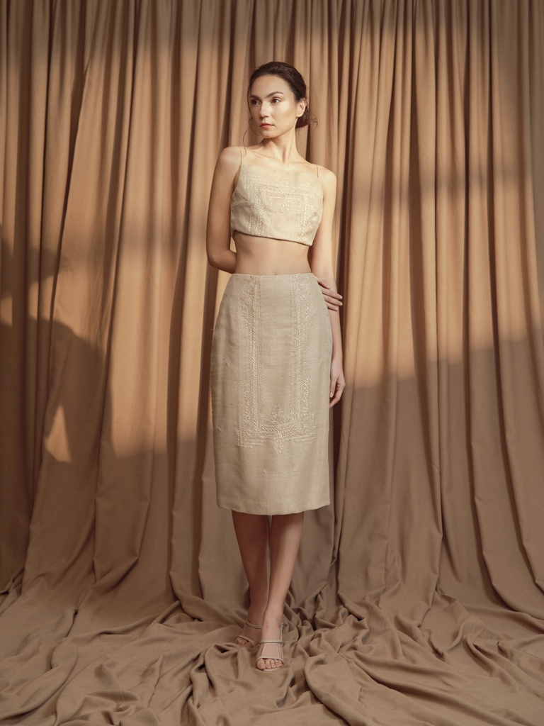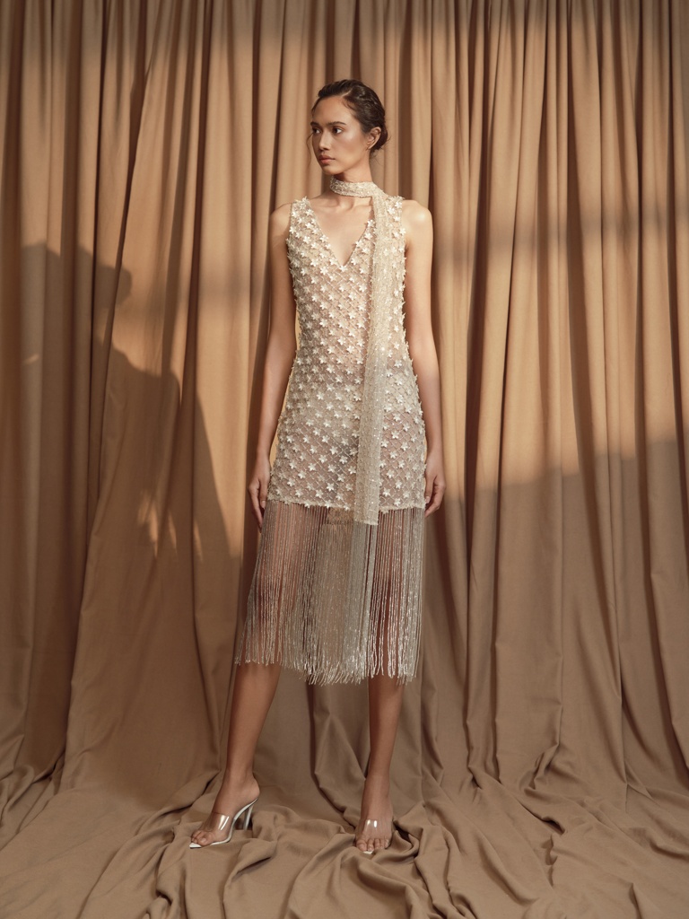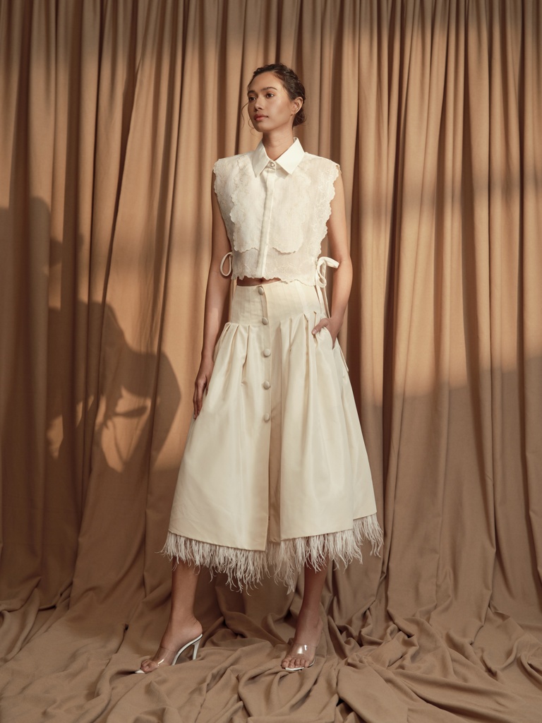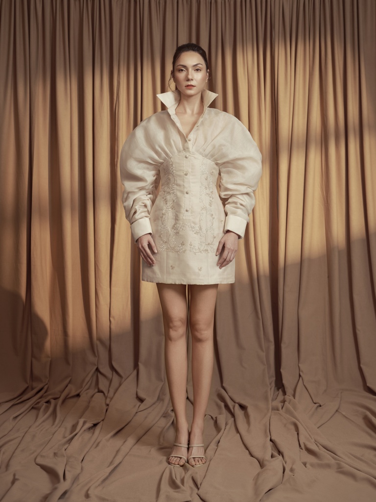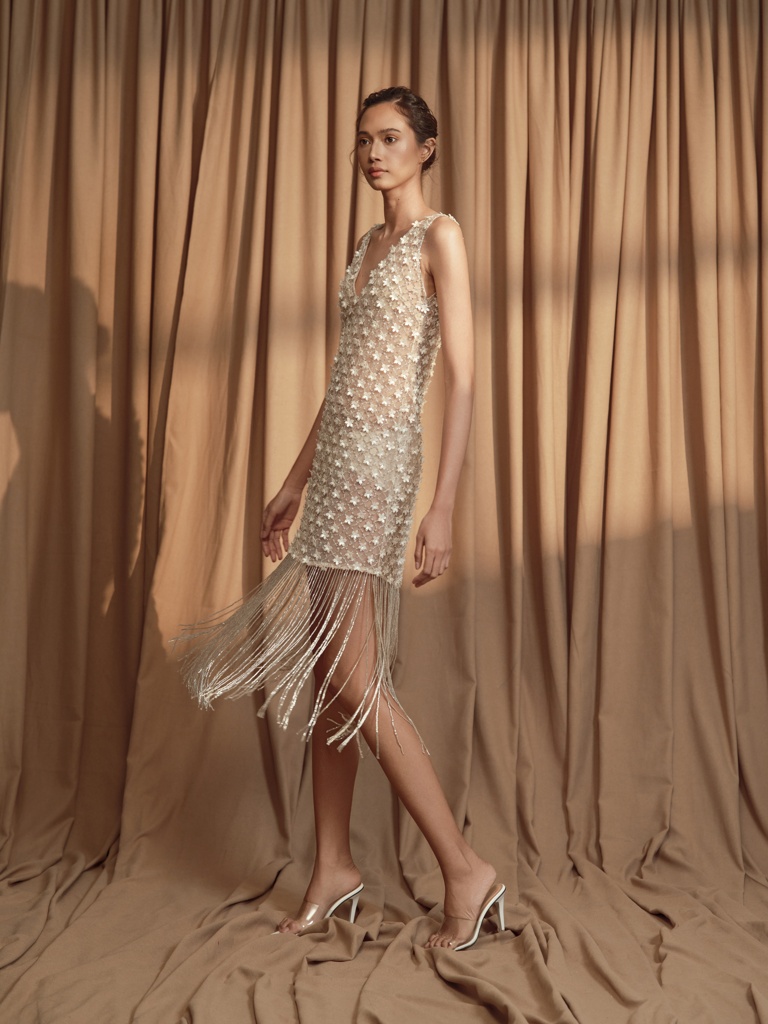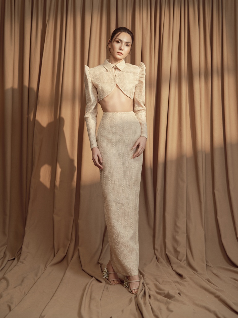 “This collection is an intimate reflection of my childhood memories spent at my grandmother’s home—I still distinctly remember the fragrance of Sampaguita flowers and the sight of elegant lace curtains and vintage heirlooms,” the designer shares. “Each piece in the collection is an homage to that space-turned-memory—an ode to the floral patterns hand-stitched by my grandmother and to the timeless beauty that exists in things passed down through generations.”