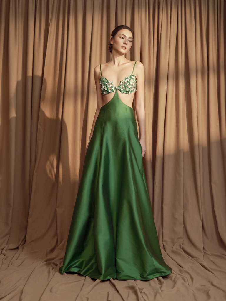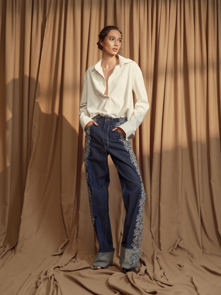 Whites and earthy mid-tones are accented by denim blues, natural neutrals, and a range of greens that evoke the lush foliage of his childhood backyard. The collection explores a balance between weight and airiness, blending the lightness of sheer fabrics with feathers, fringe, and 3D necklines, alongside the structure of more substantial materials like denim. Minuscule Sampaguita appliqués adorn key pieces throughout the collection, from sheer dresses to the side seams of denim bell bottoms.
