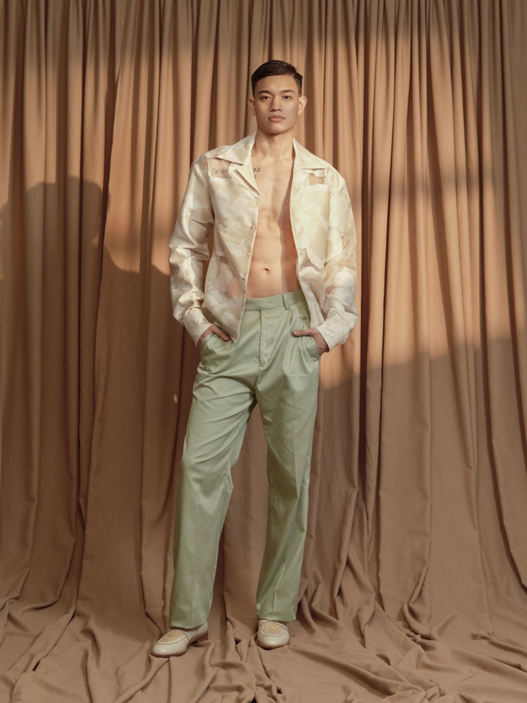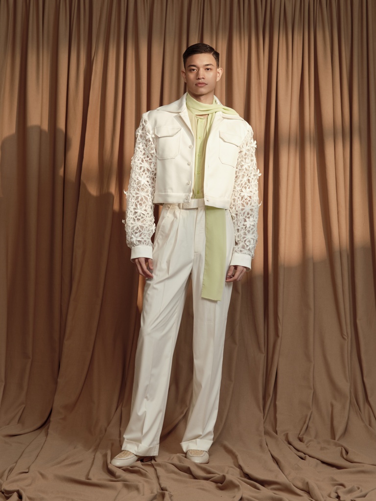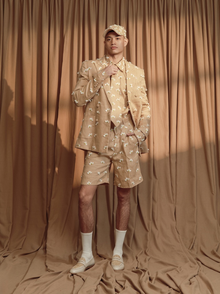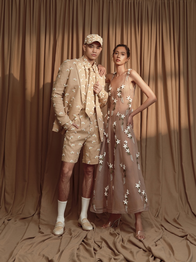 For this collection, Jot chose a theme inspired by the Sampaguita flower: a delicate product of nature that, even in its freshest form, carries a subtle depth of nostalgia. Jot recalls rummaging through a wooden armoire in his grandmother’s home, finding similar treasures made by generations before. This collection is his way of adding to the treasures that defined his childhood.