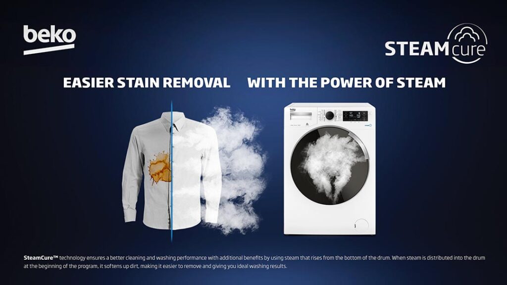 And for a truly deep clean, Beko’s SteamCure technology provides hygienic cleansing. It sanitizes clothes, removes stains, eliminates most allergens from dust and dirt, and allows for easier ironing, often reducing the need for ironing altogether.