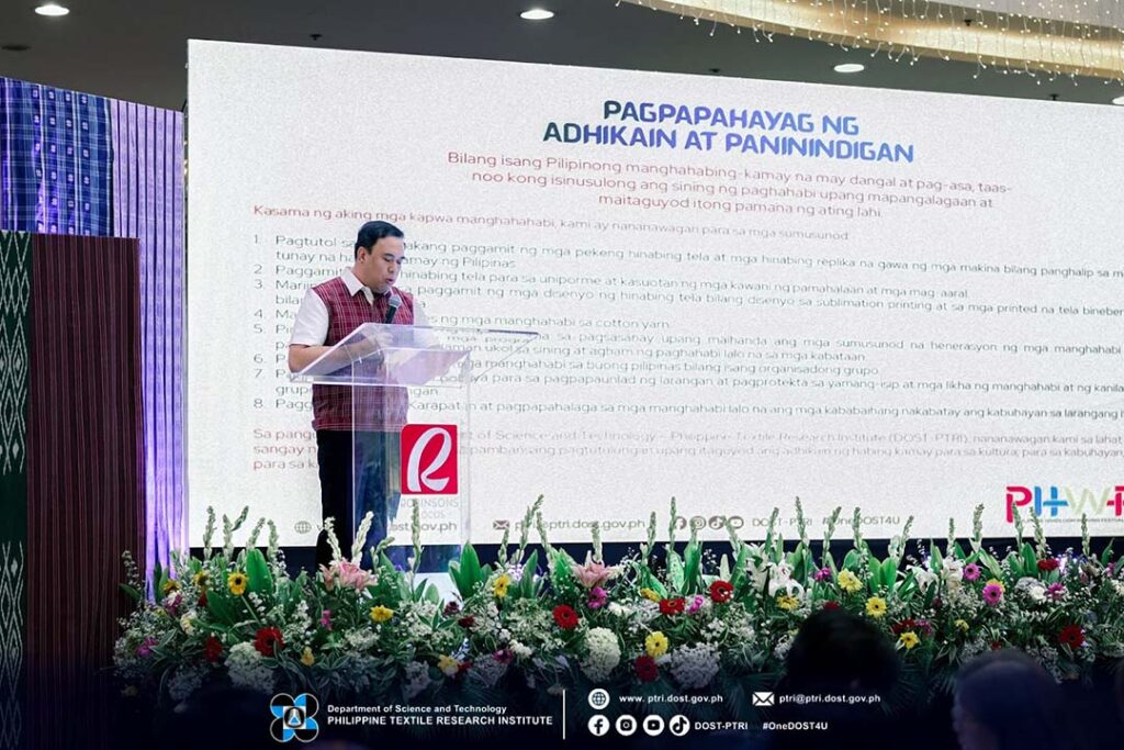 The Department of Science and Technology–Philippine Textile Research Institute (DOST–PTRI) unveiled the Weavers Manifesto at the 1st Philippine Handloom Weaving Festival in Robinsons Ilocos, Ilocos Norte, held as part of the National Science, Technology, and Innovation Week. The manifesto is a united call from Filipino weaving communities urging respect and support for authentic Philippine weaves and denouncing machine-made replicas and printed substitutes that threaten their culture, identity, and livelihoods.